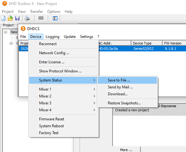 2. В Maintenance window выделяем нужный Core, открываем закладку Device, меню System Status и выполняем Save to file.