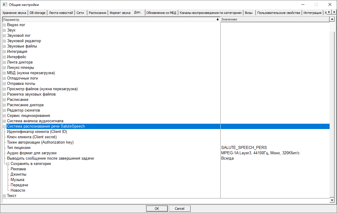 Настройка модуля производится в меню Сервис - Общие настройки - Доп. - Система распознавания речи SaluteSpeech.