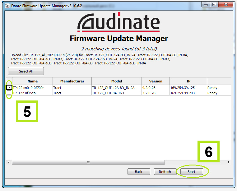 Важно: При обновлении ТР-122 с серийными номерами до SN:032 до версии Audinate Firmware 4.2.0.28 сеть Dante перестанет работать в режиме 100мБит/с .