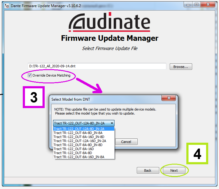 - После установки настроек нужно добавить файлы прошивок в Dante Updater: