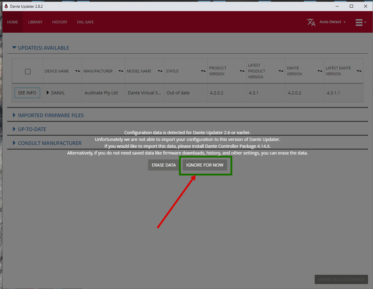 - При повторном запуске ПО Dante Updater может появиться предупреждение.